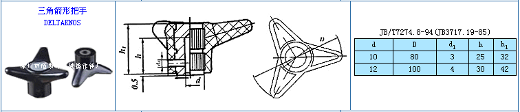 名称:三角箭形把手 材料:酚醛模塑料(胶木、电木) 外观:光亮,外形美观,自然 标准:JB/T7274.8-94